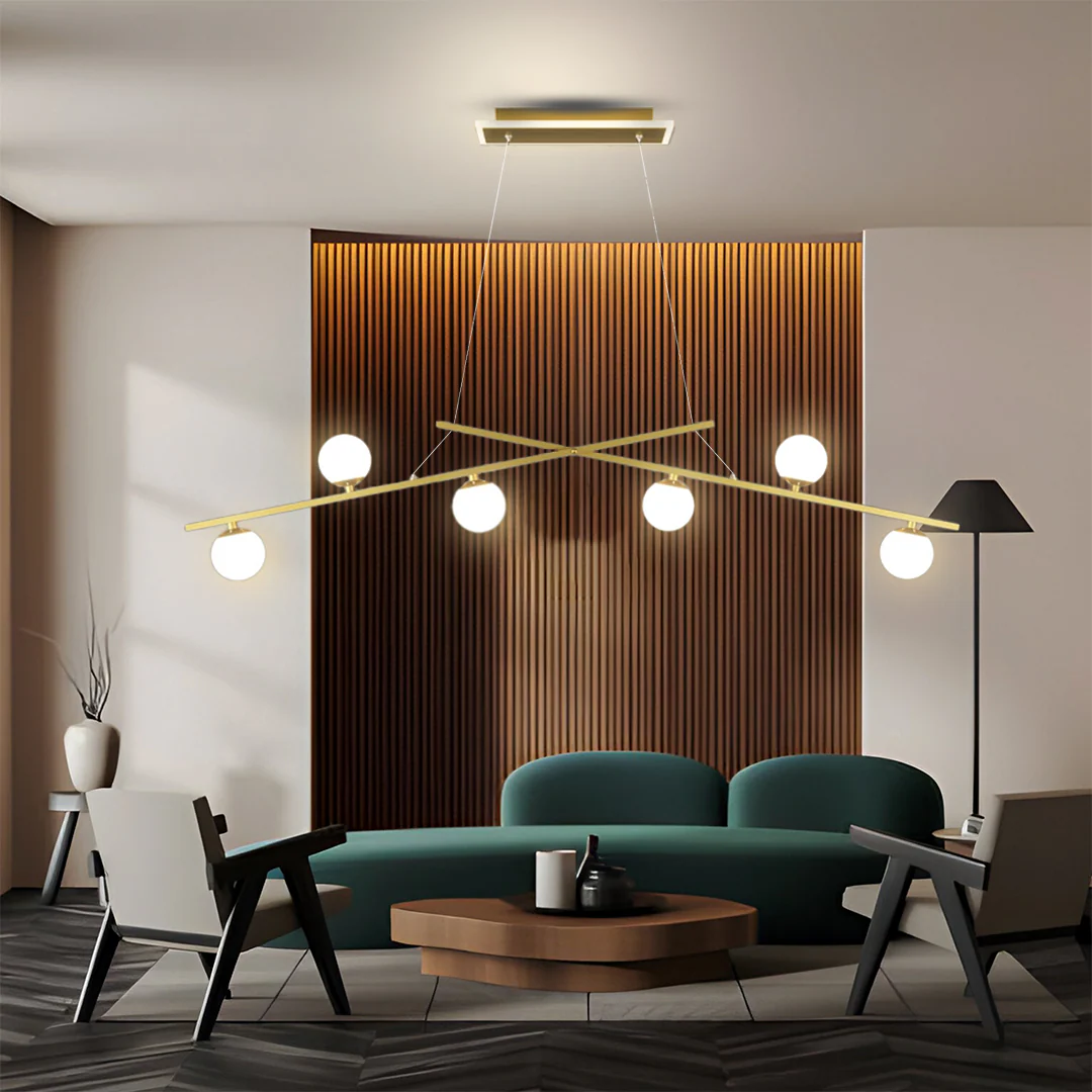 The Nora Gold LED Smart Voice Assist Chandelier features a graceful modern design with a luxurious gold finish that enhances contemporary interiors with elegant illumination.