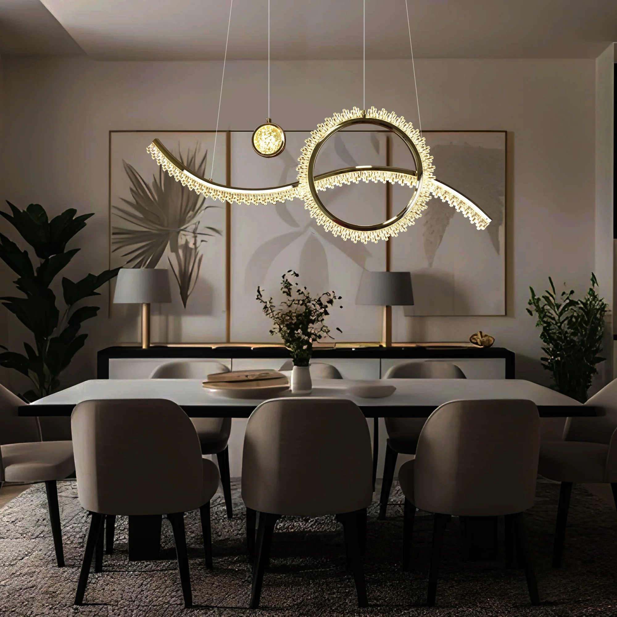 Smart control through voice assistants and a mobile app allows effortless lighting adjustments. Well suited for dining spaces, kitchen islands, and open living areas, it combines modern functionality with elegant simplicity to create a comfortable and inviting atmosphere.